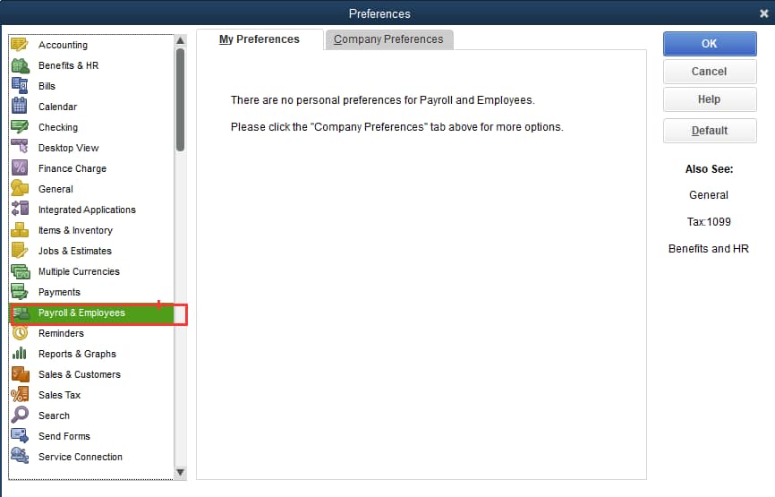In the left panel, click Payroll & Employees, then open the Company Preferences tab.
